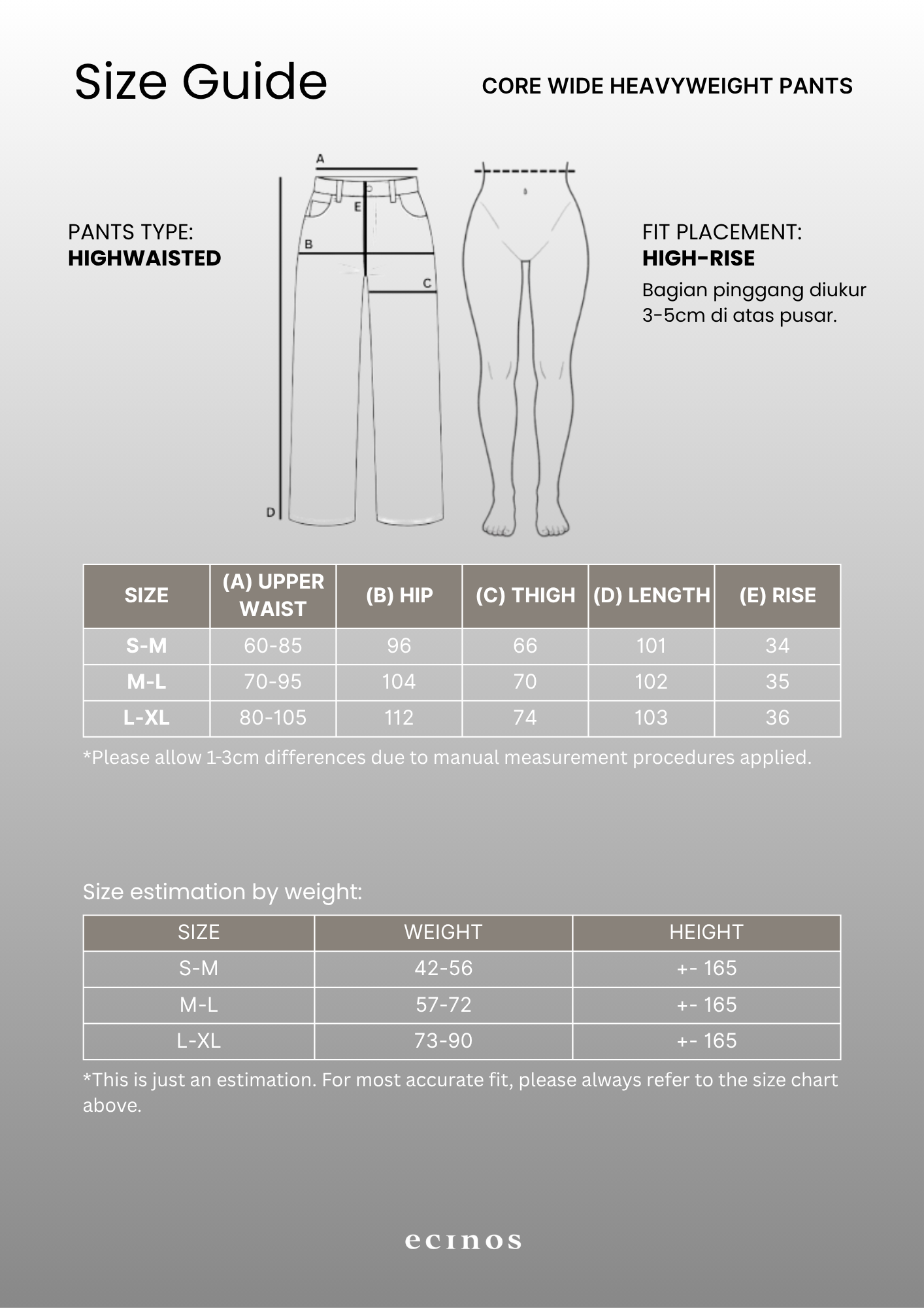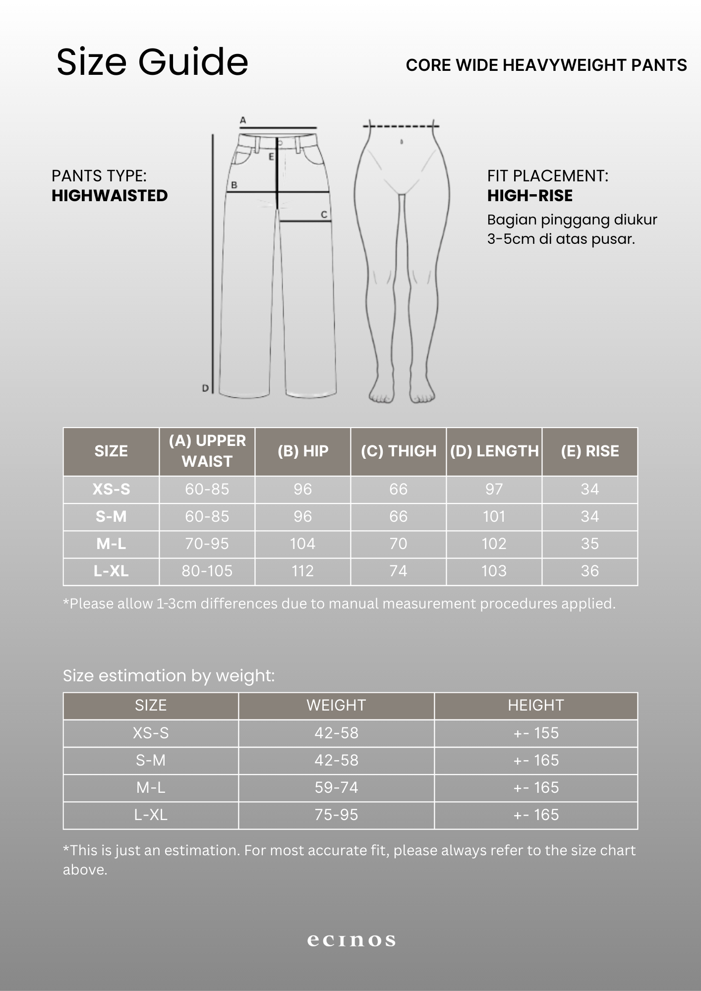 • S-M: Upper Waist: 60-85 | Length: 101 | Hip: 96 | Thigh: 66 | Front rise: 34